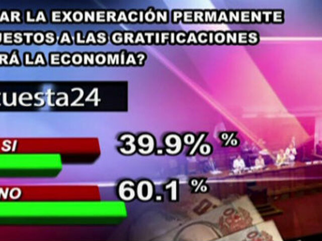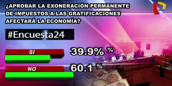 Los resultados de Encuesta 24 a la pregunta de este miércoles revelan que un 60.1% de peruanos cree que aprobar la exoneración permanente de impuestos a las gratificaciones no afectará la economía. Sin embargo, un 39.9% considera que sí podría traer repercusiones.