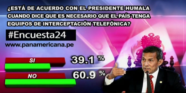 Los resultados de Encuesta 24 a la pregunta de este martes revelaron que el 60.9% de peruanos está en desacuerdo con el presidente Ollanta Humala cuando afirma que es necesario que el país tenga equipos de interceptación telefónica. Sin embargo, un 39.1% está a favor de lo dicho por el mandatario.