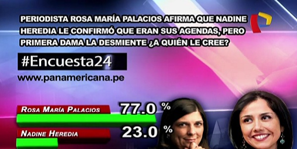 Los resultados de Encuesta 24 a la pregunta de este lunes revelaron que el 77% de peruanos le cree a Rosa María Palacios cuando afirma que Nadine Heredia le confirmó que las cuatro agendas presentadas en Panorama si le pertenecen. Sin embargo, un minoritario 23% se mostró a favor de la primera dama, quien desmintió dicha información.