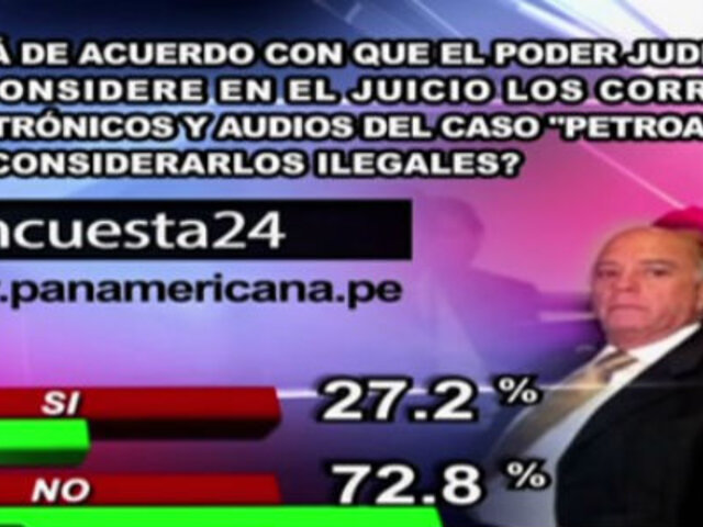 A la pregunta de este martes en Encuesta 24: “¿Está de acuerdo con que el Poder Judicial no considere en el juicio los correos electrónicos y audios del caso ‘Petroaudios’ por considerarlos ilegales?rdquo;, un mayor 72.8% votó ‘No’. Un menor 27.2% optó por el ‘Sí’.