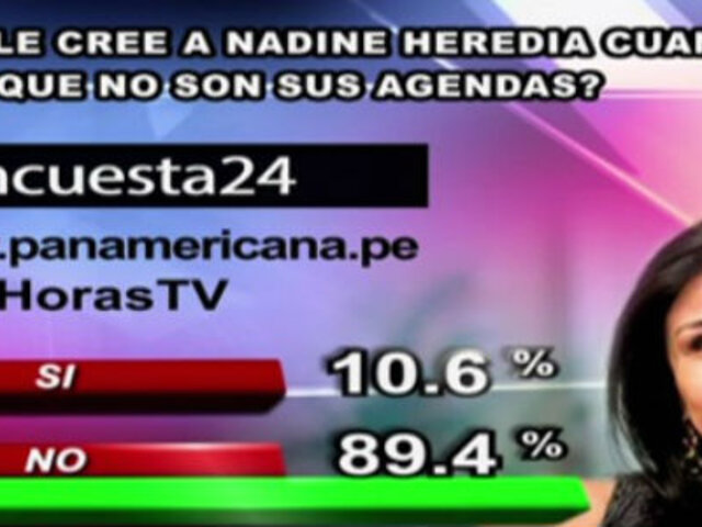 A la pregunta de este martes en Encuesta 24: “¿Usted le cree a Nadine Heredia cuando dice que no son sus agendas?rdquo;, un contundente 89.4% votó ‘No’. Un mínimo 10.6% optó por el ‘Sí’.