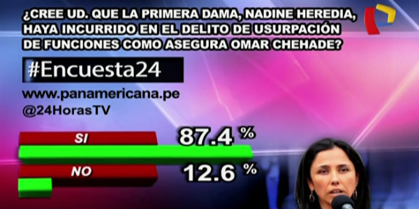 Los resultados de Encuesta 24 a la pregunta de este lunes revelaron que el 87.4% de peruanos cree que la primera dama, Nadine Heredia, incurrió en el delito de usurpación de funciones, tal como asegura el congresista Omar Chehade. Sin embargo, un minoritario 12.6% considera absolutamente todo lo contrario.