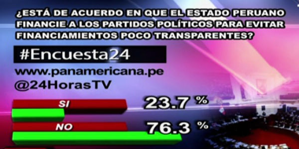 A la pregunta de este martes en Encuesta 24: “¿Está de acuerdo en que el Estado peruano financie a los partidos políticos para evitar financiamientos poco transparentes?rdquo;, un 76.3% votó ‘No’. 23.7% afirmó que ‘Sí.