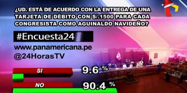 Los resultados de Encuesta 24 a la pregunta de este lunes revelaron que el 90.4% de peruanos está en desacuerdo con la entrega de una tarjeta de débito con S/. 1,500 para cada congresista como aguinaldo navideño. Sin embargo, un minoritario 9.6% se mostró a favor de esta entrega de dinero.