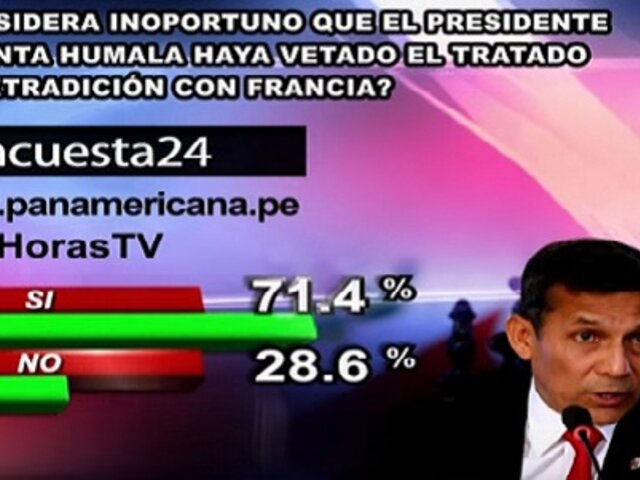 Los resultados de Encuesta 24 a la pregunta de este lunes revelaron que el 71.4% de peruanos considera inoportuno que el presidente Ollanta Humala haya vetado el tratado de extradición con Francia. Sin embargo, un minoritario 28.6 % considera lo contrario.