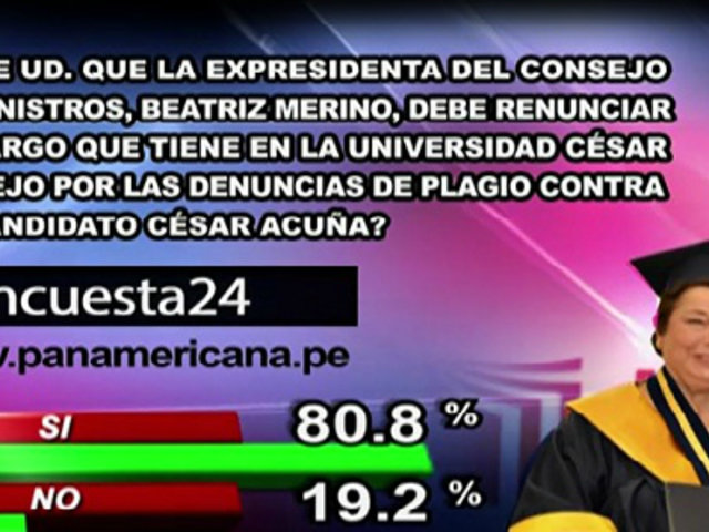 Los resultados de Encuesta 24 a la pregunta de este lunes revelaron que el 80.8% de peruanos cree que Beatriz Merino debe renunciar al cargo que tiene en Universidad César Vallejo (UCV), por las denuncias de plagio contra el candidato César Acuña. Sin embargo, un minoritario 19.2 % considera lo contrario.