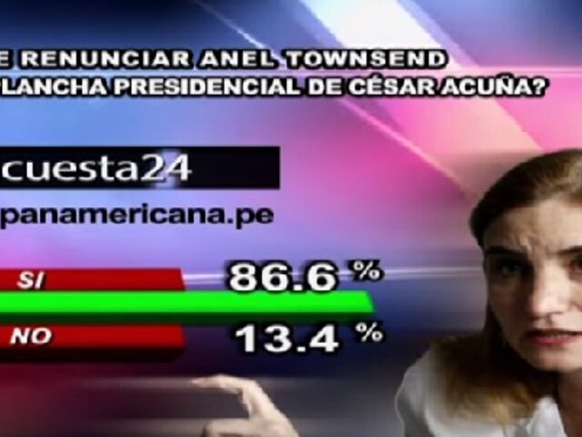 A la pregunta de este miércoles en Encuesta 24: “¿Debe renunciar Anel Townsend a la plancha residencial de César Acuña?rdquo;, un elocuente 86.6% votó ‘Sí’. Un menor 13.4% optó por el ‘No’.