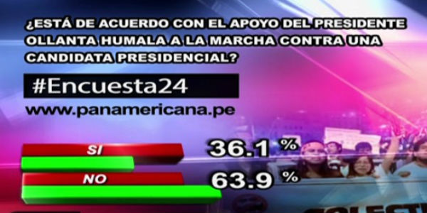 A la pregunta de este martes en Encuesta 24: “¿Está de acuerdo con el apoyo del presidente Ollanta Humala a la marcha contra una candidata presidencial?rdquo;, un 63.9% votó ‘No’. El menor 36.1% dijo ‘Sí’.