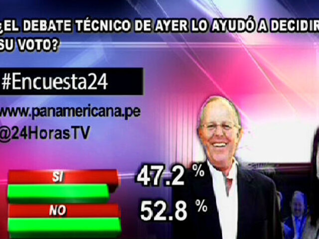 A la pregunta de este viernes en Encuesta 24: “¿El debate técnico del último domingo le ayudó a decidir su voto?rdquo;, un mayoritario 52.8% votó ‘NO’. Un importante 47.2% dijo ‘SÍ’.