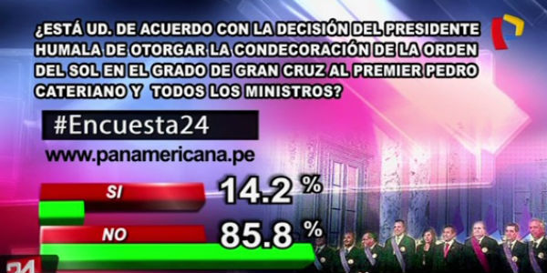 A la pregunta de este martes en Encuesta 24: “¿Está usted de acuerdo con la decisión del presidente Humala de otorgar la condecoración de la Orden del Sol en el grado de Gran Cruz al premier Pedro Cateriano y todos los ministros?rdquo;, un rotundo 85.8% votó ‘No’. Solo el 14.2% dijo ‘Sí’.