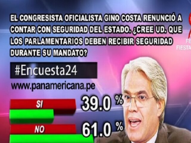A la pregunta de este martes en Encuesta 24: Luego que el congresista oficialista Gino Costa renunciara a contar con seguridad del Estado “¿Cree usted que los parlamentarios deben recibir seguridad durante su mandato?rdquo;, un 61% votó ‘No’, mientras que el 39% dijo ‘Sí’.