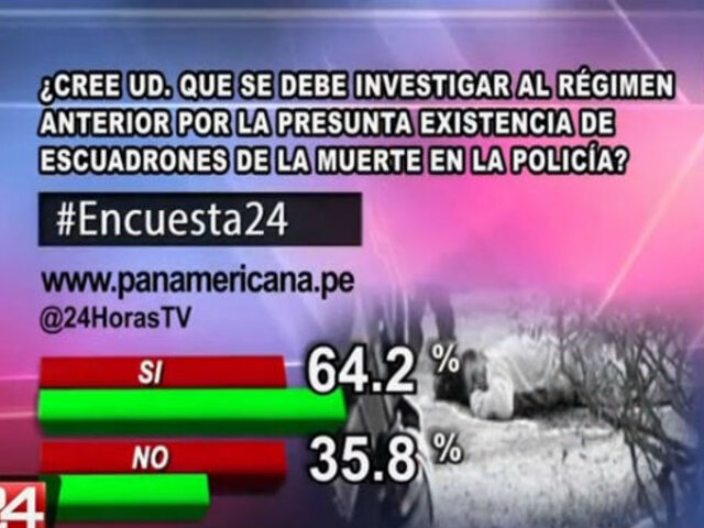 A la pregunta de este lunes en Encuesta 24: ¿Cree usted que se debe investigar al régimen anterior por la presunta existencia de escuadrones de la muerte en la policía? Un 64.2% dijo que sí y un 35.8% señaló que no.