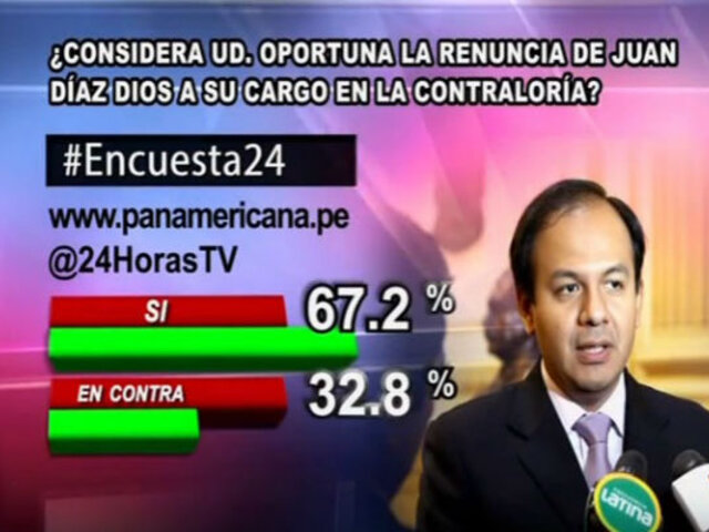 A la pregunta de este jueves en Encuesta 24: “¿Considera usted oportuna la renuncia de Juan Día Dios a su cargo en la Contraloría de la República?rdquo;, un mayor 67.2% respondió ‘Sí’, un significativo 32.8% contestó ‘No’.