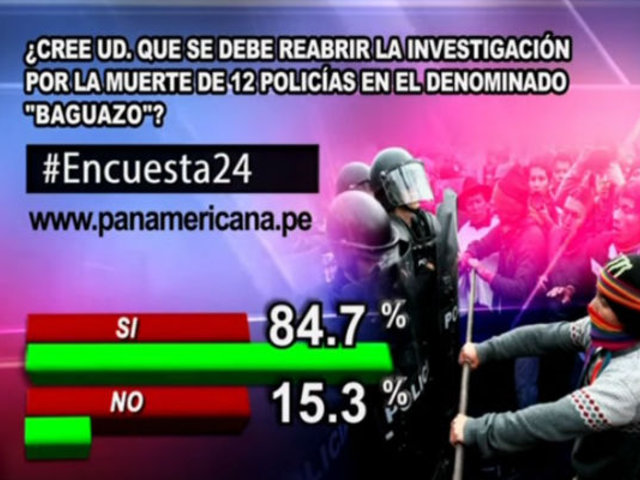 A la pregunta de este jueves en Encuesta 24: ¿Cree usted que se debe reabrir la investigación por la muerte de 12 policías en el denominado ‘Baguazo’?, un 84.7% respondió ‘SÍ’, mientras que un 15.3% contestó ‘NO’.