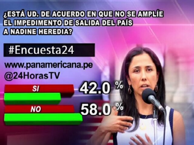 A la pregunta de este viernes en Encuesta 24: ¿Está usted de acuerdo en que no se amplíe el impedimento de salida del país a Nadine Heredia?, un 58.0% respondió ‘NO’, mientras que un 42% contestó ‘SÍ’.