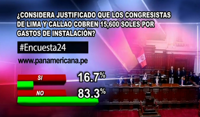 La mayoría de encuestados en 24 Horas consideró injustificado que los congresistas de Lima y Callao, cobren 15 mil 600 soles por gastos de instalación.
