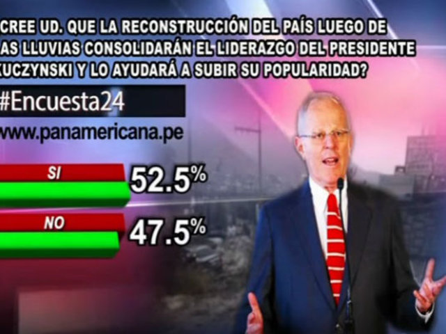 A la pregunta de este lunes en Encuesta 24: ¿Cree usted que la reconstrucción del país luego de las lluvias consolidarán el liderazgo del presidente Pedro Pablo Kuczynski y lo ayudará a subir su popularidad? un 52.5% respondió ‘SI’, mientras que un 47.5% contestó ‘NO’.