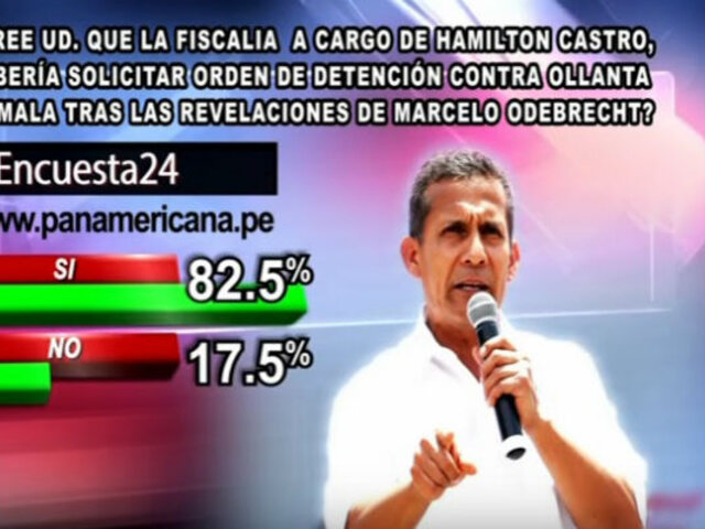 A la pregunta de este miércoles en Encuesta 24: ¿Cree usted que la Fiscalía a cargo de Hamilton Castro debería solicitar orden de detención contra Ollanta Humala tras las revelaciones de Marcelo Odebrecht? un 82.5% respondió ‘SI’, mientras que un 17.5% contestó ‘NO’.