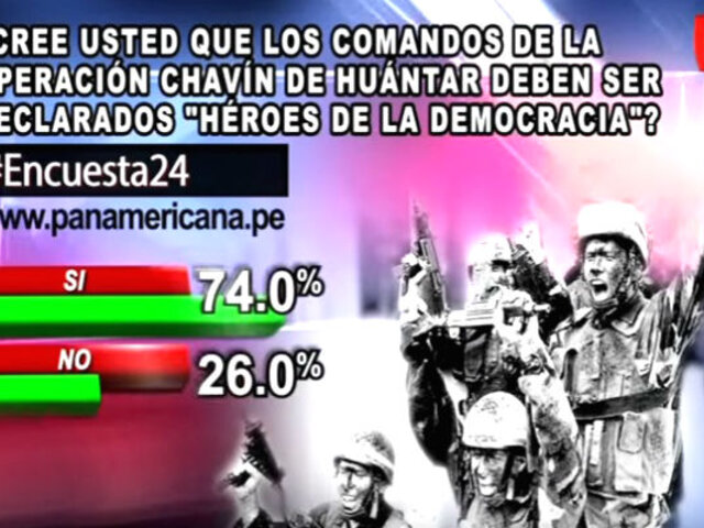 A la pregunta de este lunes en Encuesta 24: ¿Cree usted que los comandos de la operación Chavín de Huántar deben ser declarados como “Héroes de la Democracia”? Un 74% respondió ‘SI’, mientras que un 26% contestó ‘NO’.