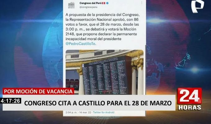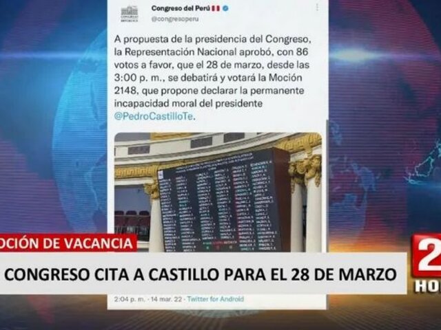 Con 86 votos a favor, el Congreso de la República aprobó debatir y votar sobre la moción de vacancia por incapacidad moral contra el presidente de la República, Pedro Castillo. El mandatario fue citado este lunes 28 de marzo para tal caso.