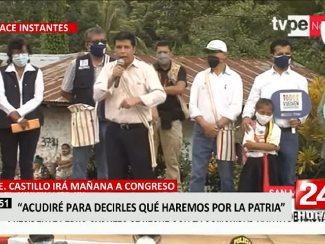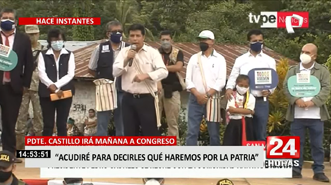 “Los congresistas han asistido al pleno y lo primero que han hecho es aprobar mi presencia el día de mañana. Pedí que mañana sea a las 9 am para dirigirme al país, pero iré respetando el horario que a puesto el Legislativo. Mañana acudiré al Parlamento a decir a que hemos venido y que vamos hacer por la patria, a las 5 de la tarde”, mencionó el mandatario en un mitin en la región San Martín.