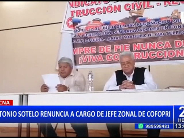 En Tacna, durante una rueda de prensa en el local del sindicato de construcción civil, Antonio Sotelo Calderon anunció que renunciaría a su cargo, como jefe zonal del Organismo de Formalización de la Propiedad Informal (Cofopri).