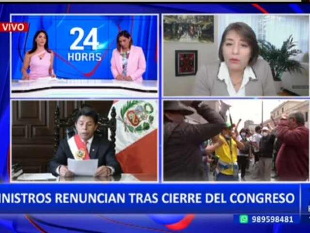 La exministra de Justicia, Delia Muñoz, se refirió al anuncio del presidente Pedro Castillo, en la que implantó un estado de excepción y disolvió el Congreso. “Es bastante clara la situación de ruptura constitucional”, manifestó la exministra de Justicia, pues un estado de excepción no se puede establecer sobre cuestiones como el cierre del Congreso, convocatoria a nuevas elecciones, reorganizar el Ministerio Público, el Poder Judicial y la Junta Nacional de Justicia”, enfatizó.