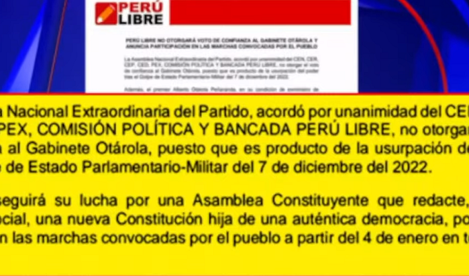 A través de un comunicado la bancada de Perú Libre, informó que no le darán el voto de confianza al gabinete de Alberto Otárola, ya que consideran que es producto de una usurpación de poderes tras el golpe de Estado Parlamentario-Militar del 7 de diciembre por Pedro Castillo.