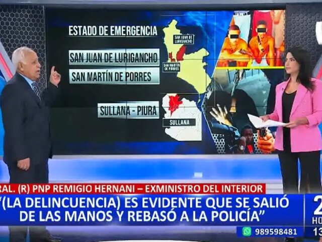 El exministro del Interior, Remigio Hernani, dio sus impresiones sobre si será efectiva o no, la declaratoria de emergencia de San Juan de Lurigancho, San Martín de Porres y Sullana, medida tomada para recuperar los mencionados distritos del avance de la delincuencia.