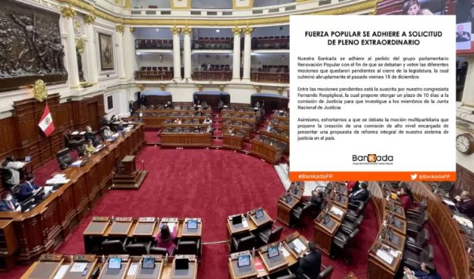 La bancada de Fuerza Popular respaldó el pedido de Renovación Popular, que solicitó que a la Mesa Directiva que se programe una sesión extraordinaria del Pleno para debatir y votar las mociones que quedaron pendientes en la última legislatura.