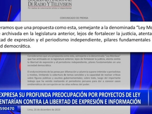La Sociedad Nacional de Radio y Televisión (SNRTV) expresó su preocupación ante los recientes proyectos de ley presentados por las bancadas de Perú Libre y el Bloque Magisterial, los cuales proponen modificaciones en el Código Penal y Civil relacionadas con difamación, calumnia y el derecho a rectificación.