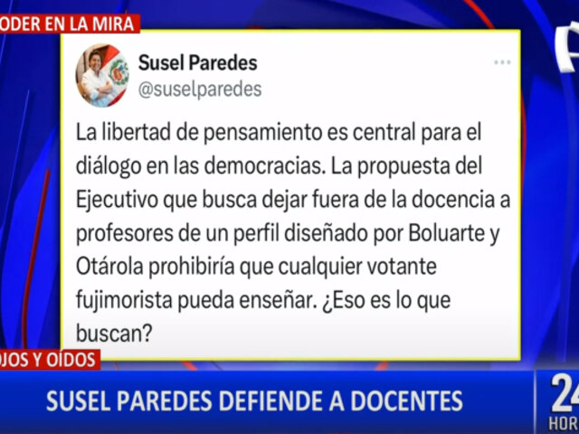 Después que el Ejecutivo presentará un proyecto de ley donde busca destituir a profesores que tengan afiliaciones políticas, la congresista Susel Paredes mencionó que la presidenta Dina Boluarte y el premier Alberto Otárola buscan crear docentes con un perfil asociado al fujimorismo.