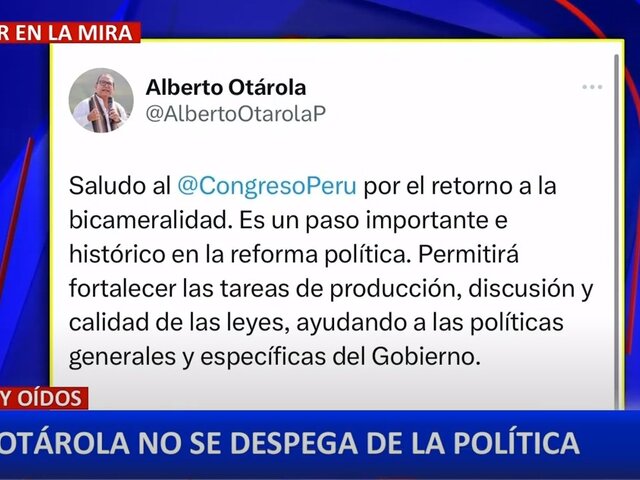 Recientemente, a través de su cuenta de Twitter, Otárola saludó la aprobación de la Bicameralidad por parte del Congreso de la República, indicando que fortalecerá la tarea en la discusión y calidad de las leyes aprobadas.