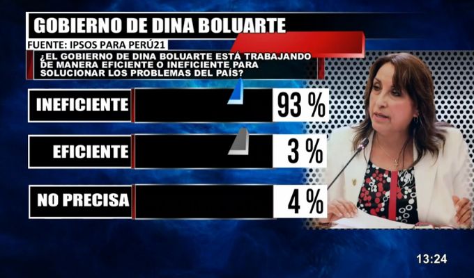 Y es que el día de hoy, la empresa IPSOS, a cargo de Perú 21, publicó una encuesta donde se revela que el 93% de la población califica de "ineficiente", el trabajo de la mandataria frente a los principales flagelos del Perú.