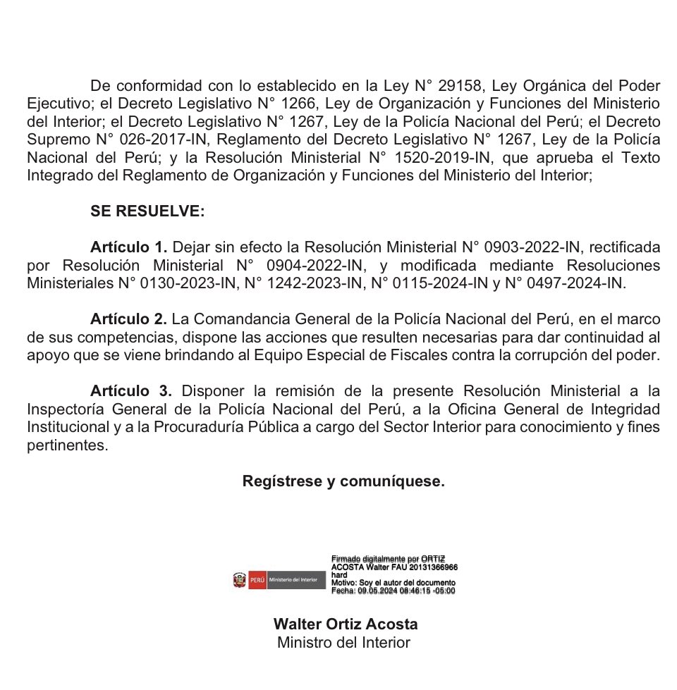 El ministro del Interior, Walter Ortiz, ha firmado una resolución que revoca las resoluciones ministeriales previas que establecían la existencia de este equipo de apoyo policial.