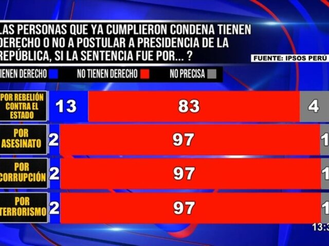 De acuerdo a una reciente encuesta de Ipsos, el 97% de los ciudadanos considera que las personas que cumplieron sentencia por asesinato, corrupción o terrorismo y ya salieron de la cárcel, no deberían tener derecho a postular a la Presidencia de la República.