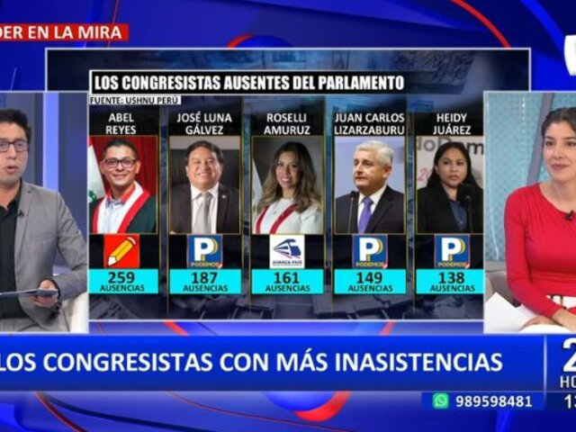 En el segundo lugar lo sigue el congresista y líder de Podemos Perú, José Luna Gálvez, quien lleva ya 187 ausencias al Palacio Legislativo. El tercer lo ocupa la extercera vicepresidenta de la Mesa Directiva, Rosselli Amuruz, con 161 ausencias.