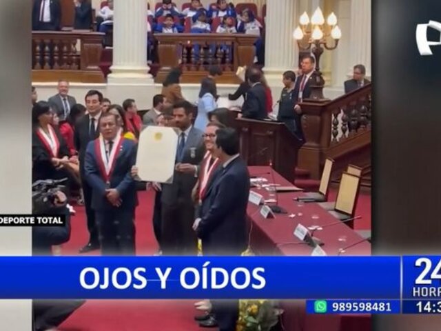 El velerista fue recibido en el hemiciclo de sesiones del Parlamento, donde recibió un reconocimiento de manos de los congresistas Alejandro Cavero, Patricia Chávez y el presidente del Congreso, Eduardo Salhuana, entre otros.