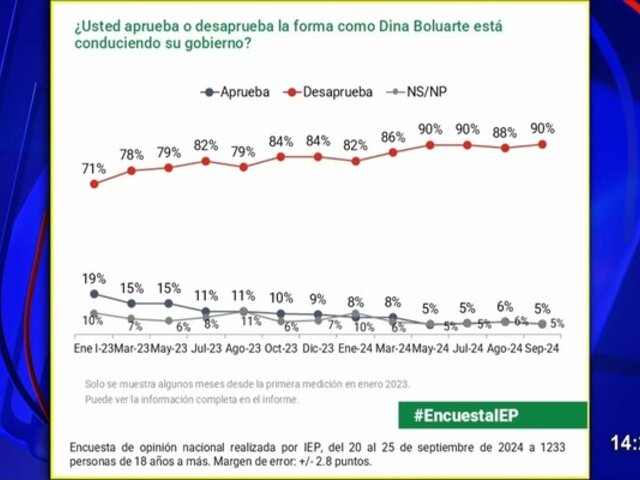 Estudio de IEP revela un alto nivel de desaprobación hacia el gobierno de Boluarte y el desempeño del Parlamento.