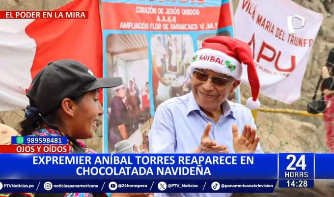 El expresidente del Consejo de Ministros, Aníbal Torres, reapareció en una chocolatada navideña realizada en el distrito de Villa María del Triunfo (VMT), organizada por su partido, Adelante Pueblo Unido (APU).