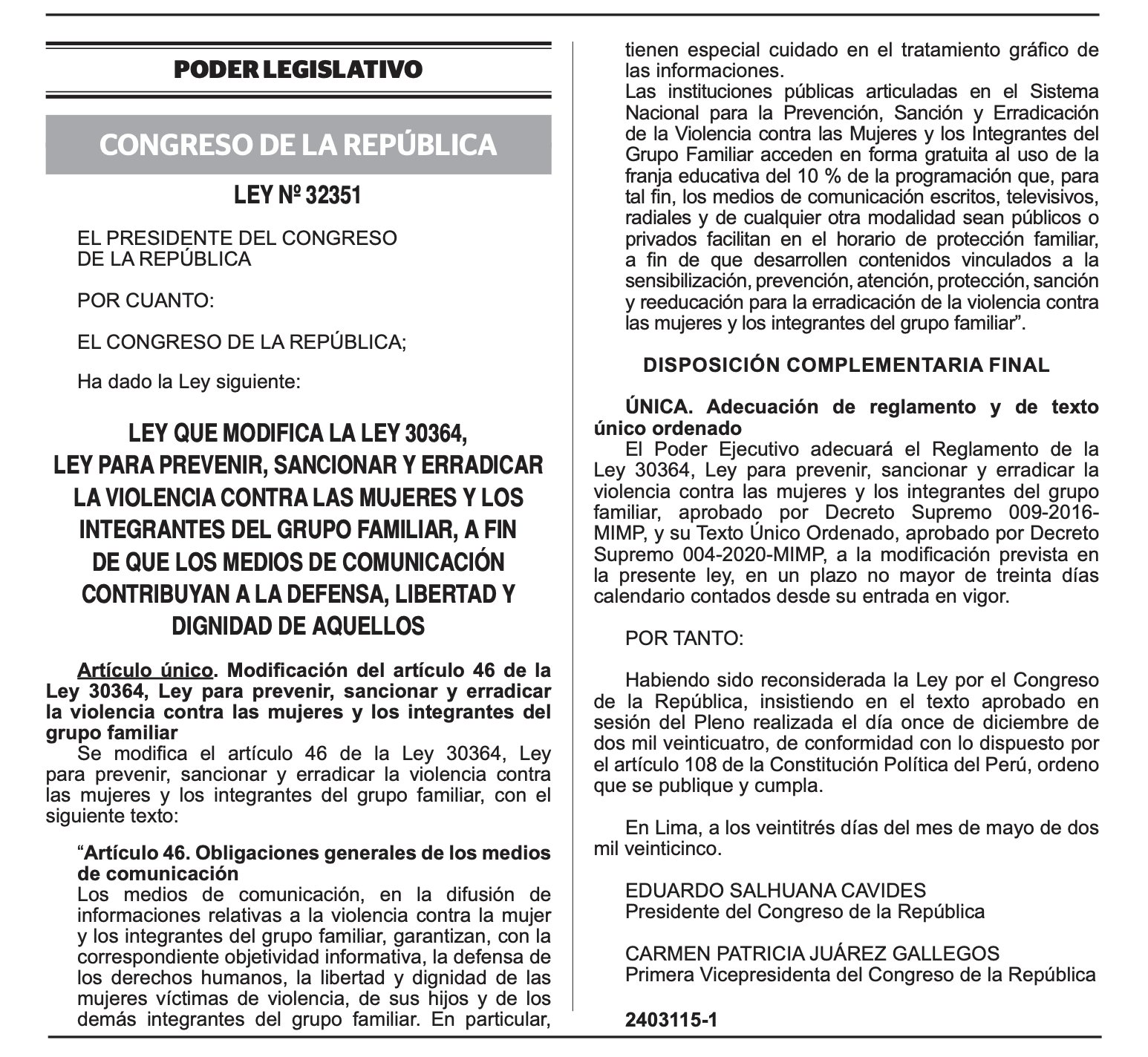El Congreso de la República del Perú ha promulgado la Ley N° 32351, que reforma la Ley 30364 con el propósito de combatir la violencia contra las mujeres y los integrantes del grupo familiar. La nueva normativa establece que los medios de comunicación están obligados a destinar un porcentaje de su programación para difundir mensajes relacionados con la prevención y erradicación de este problema social. Según el texto oficial, "los medios de comunicación, en la difusión de informaciones relativas a la violencia contra la mujer y los integrantes del grupo familiar, garantizarán la correspondiente objetividad informativa".
