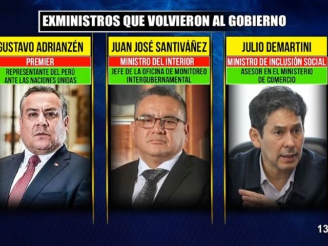 Luego de ser censurado a fines de marzo por el Congreso, el exministro del Interior, Juan José Santiváñez, fue designado como jefe de la Oficina de Monitoreo Intergubernamental del despacho presidencial. Por su parte, el extitular del Midis, Julio Demartini, fue nombrado asesor en el Ministerio de Comercio Exterior y Turismo.