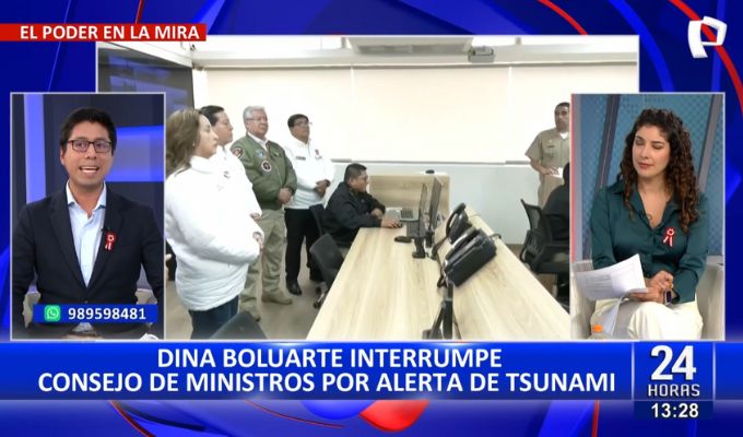 Esta decisión se debe a la alerta de tsunami emitida en el litoral peruano. La jefa de Estado interrumpió la sesión de la PCM en Palacio de Gobierno para dirigirse al Centro de Hidrografía y Navegación del Perú.