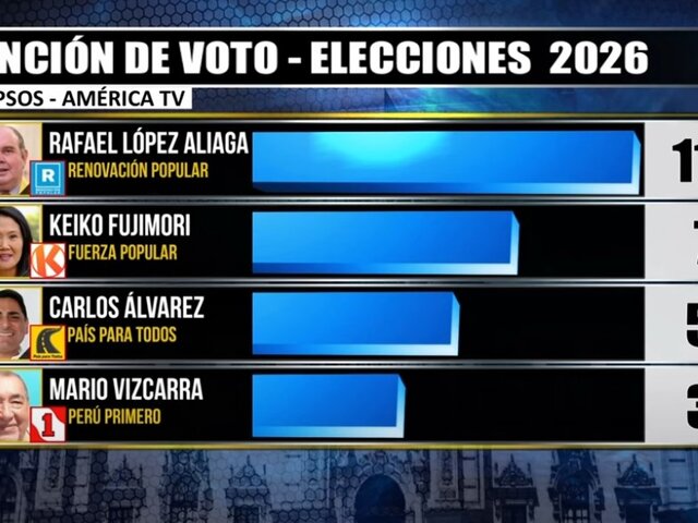 Según el último sondeo de Ipsos para América Televisión, Rafael López Aliaga, líder de Renovación Popular y actual alcalde de Lima, encabeza la intención de voto con un 11%. En segundo lugar, se ubica Keiko Fujimori, lideresa de Fuerza Popular, con un 7%.