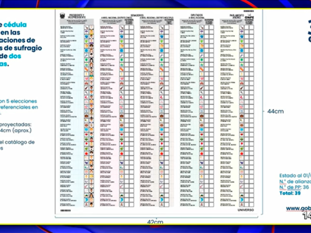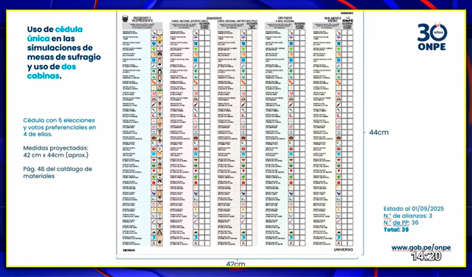 La Oficina Nacional de Procesos Electorales (ONPE) presentó por primera vez en el Congreso un modelo de la cédula electoral que se utilizará en los comicios generales de 2026. El documento, que tendrá un tamaño considerable de 44 centímetros de alto por 42 de ancho, se perfila como uno de los más extensos de la historia electoral reciente, debido a la gran cantidad de listas en contienda. Solo en la elección presidencial se han inscrito 39 fórmulas, a lo que se suman miles de postulantes al Congreso, Senado y Parlamento Andino.