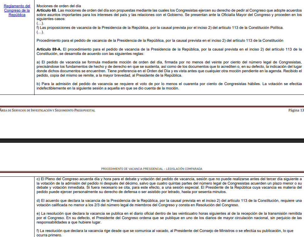 De acuerdo con la norma, el pedido de vacancia debe ser firmado por al menos el 20% de los congresistas y puede ser admitido solo si obtiene el voto de por lo menos el 40% del número legal de miembros del Congreso, es decir, 104 votos. El reglamento señala expresamente que “la votación se efectúa indefectiblemente en la siguiente sesión a aquella en que se dio cuenta de la moción”, lo que significa que la admisión no puede realizarse el mismo día en que se presenta.