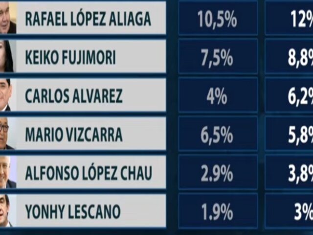 Detrás de López Aliaga y Fujimori Higuchi, se ubica Carlos Álvarez con el 6.2% del apoyo ciudadano. En el cuarto lugar se posiciona el hermano de Martín Vizcarra y candidato de Perú Primero, Mario Vizcarra, quien alcanza un respaldo de 5.8%.