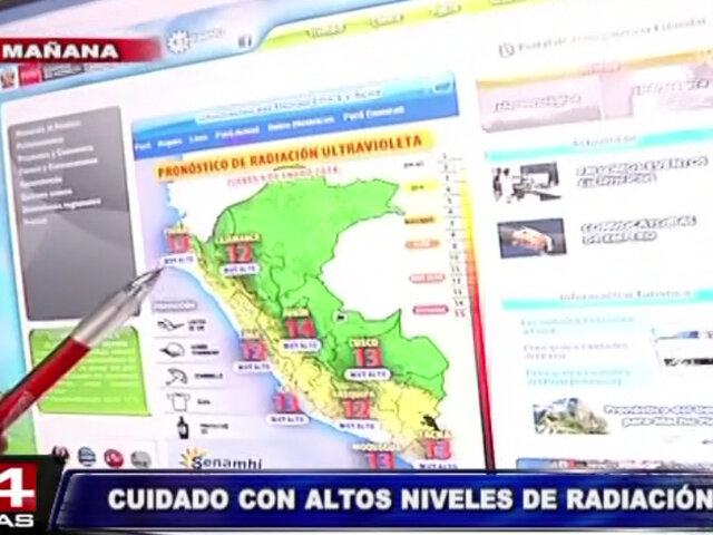 El Servicio Nacional de Meteorología e Hidrología informó que las regiones de Lima, Piura y Tumbes registrarán índices altos de radiación ultravioleta en las próximas semanas, y en algunos casos extremos. Las regiones de Piura, Tumbes y Junín registrarán niveles de hasta 14.5, mientras que Lima hasta el nivel 15. En ese sentido se recomienda utilizar gorros de ala ancha que cubra no solo el rostro sino también las orejas.