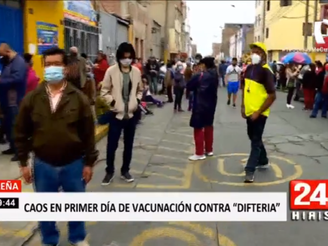 Durante el primer día de la jornada nacional de vacunación para prevenir la Difteria y otras enfermedades, se registródesorden, caos, aglomeraciones y largas colas en diferentes puntos de la capital como en Breña donde cientos de personas llegaron a la Plaza de Armas para intentar acceder a una vacuna.