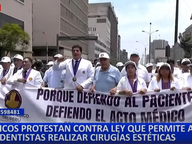 Cientos de médicos afiliados al Colegio Médico del Perú (CMP) realizan una marcha en la Plaza San Martín exigiendo la derogación de la Ley 32210. Según los manifestantes, la norma permite que odontólogos realicen procedimientos médicos estéticos sin la preparación adecuada, poniendo en riesgo a los pacientes.